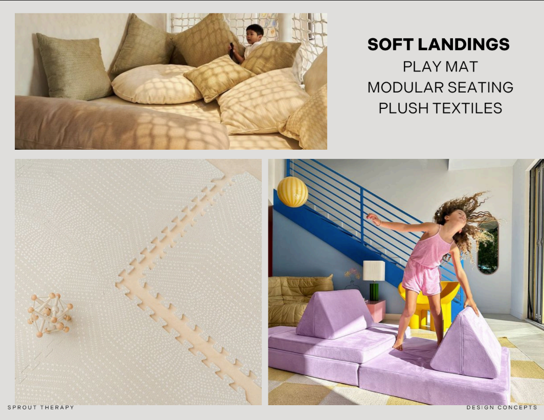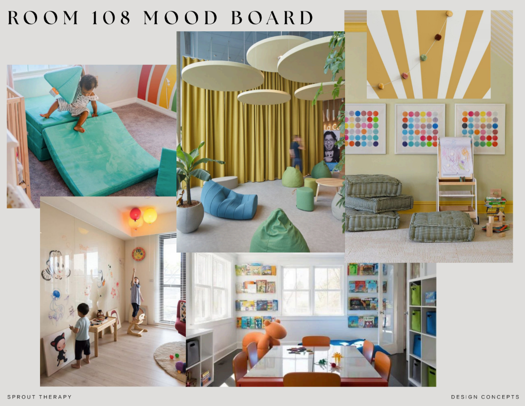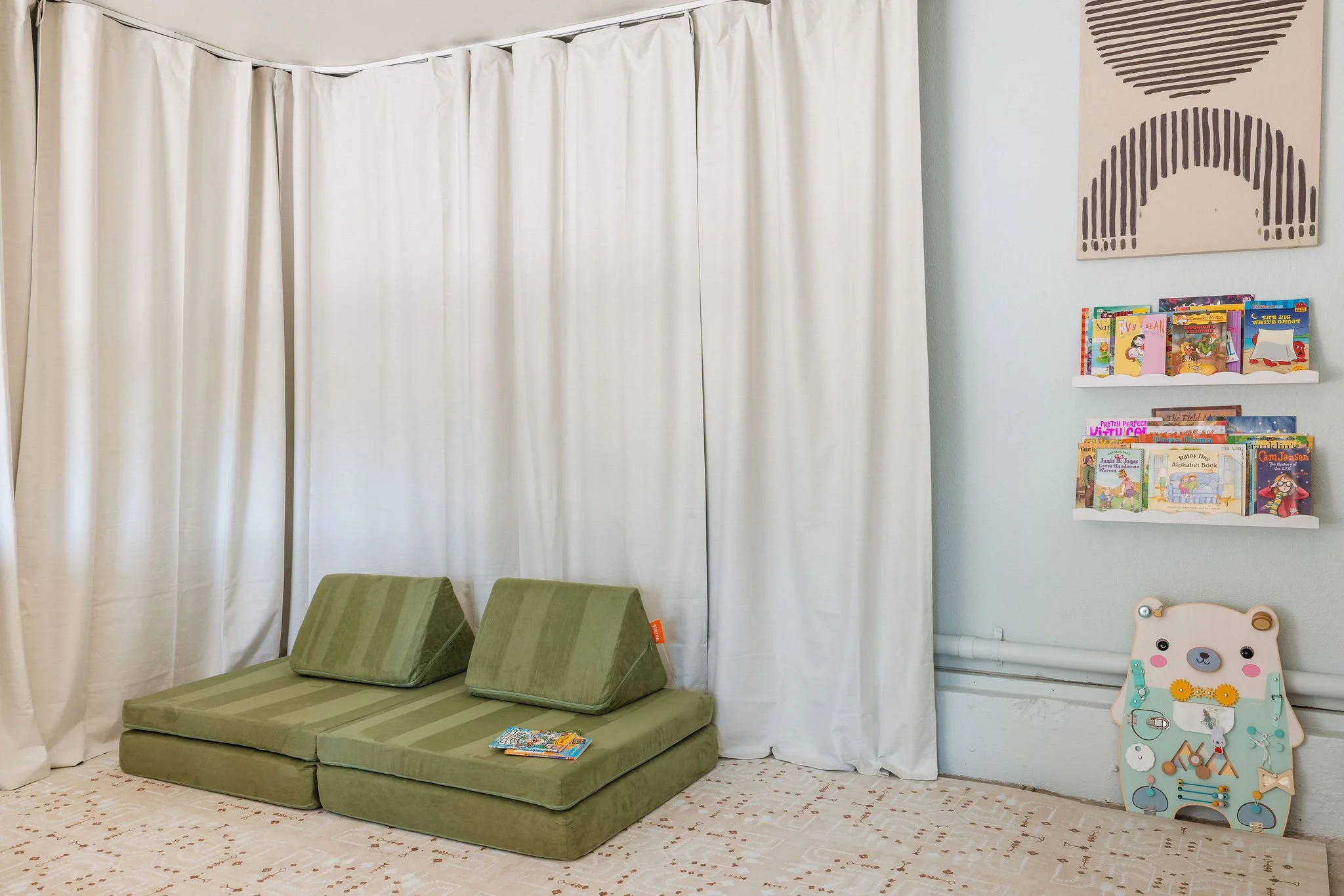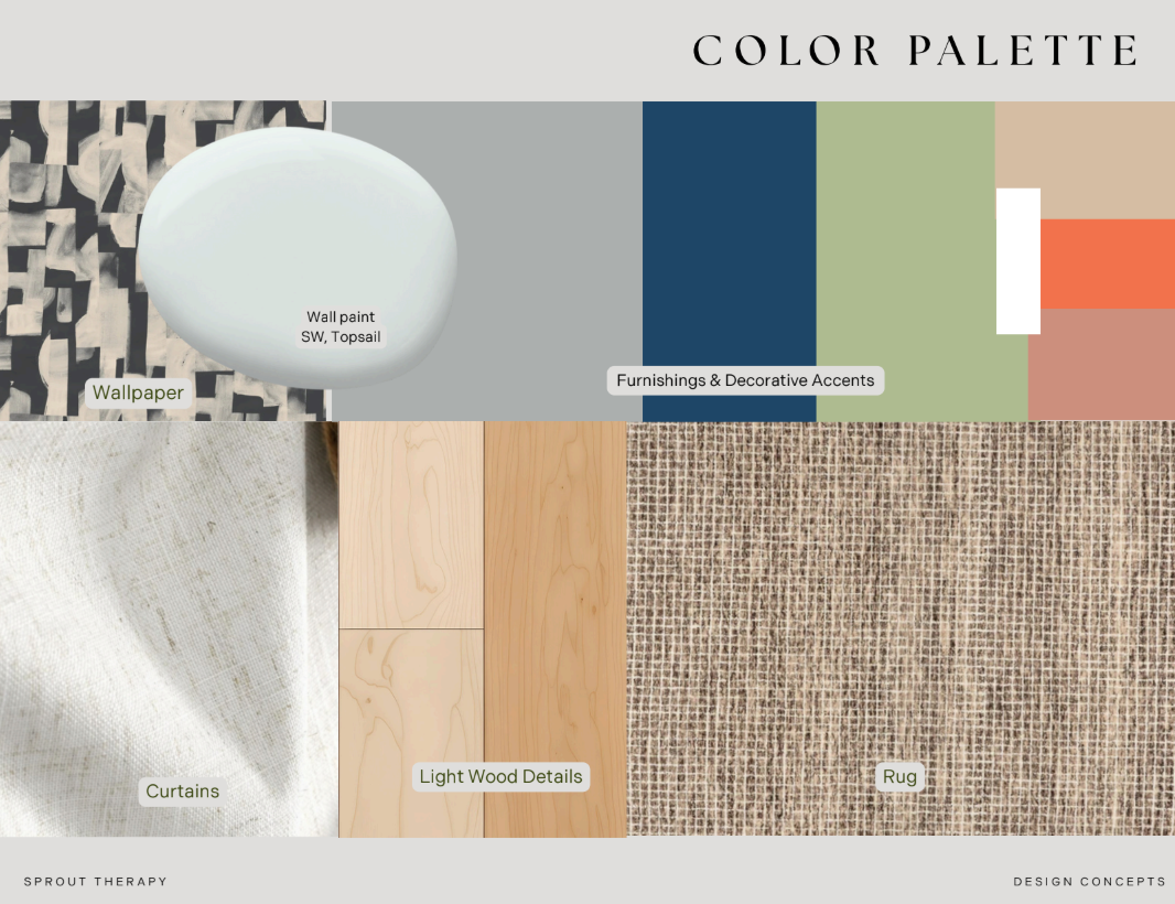 The client, a therapy practice owner and new mother, needed a therapy room design where she could hold sessions and real life at the same time, including days when her child would be with her at work. We envisioned a space where family presence and play-therapy was supported and welcomed.