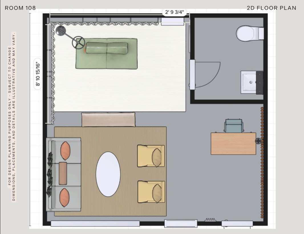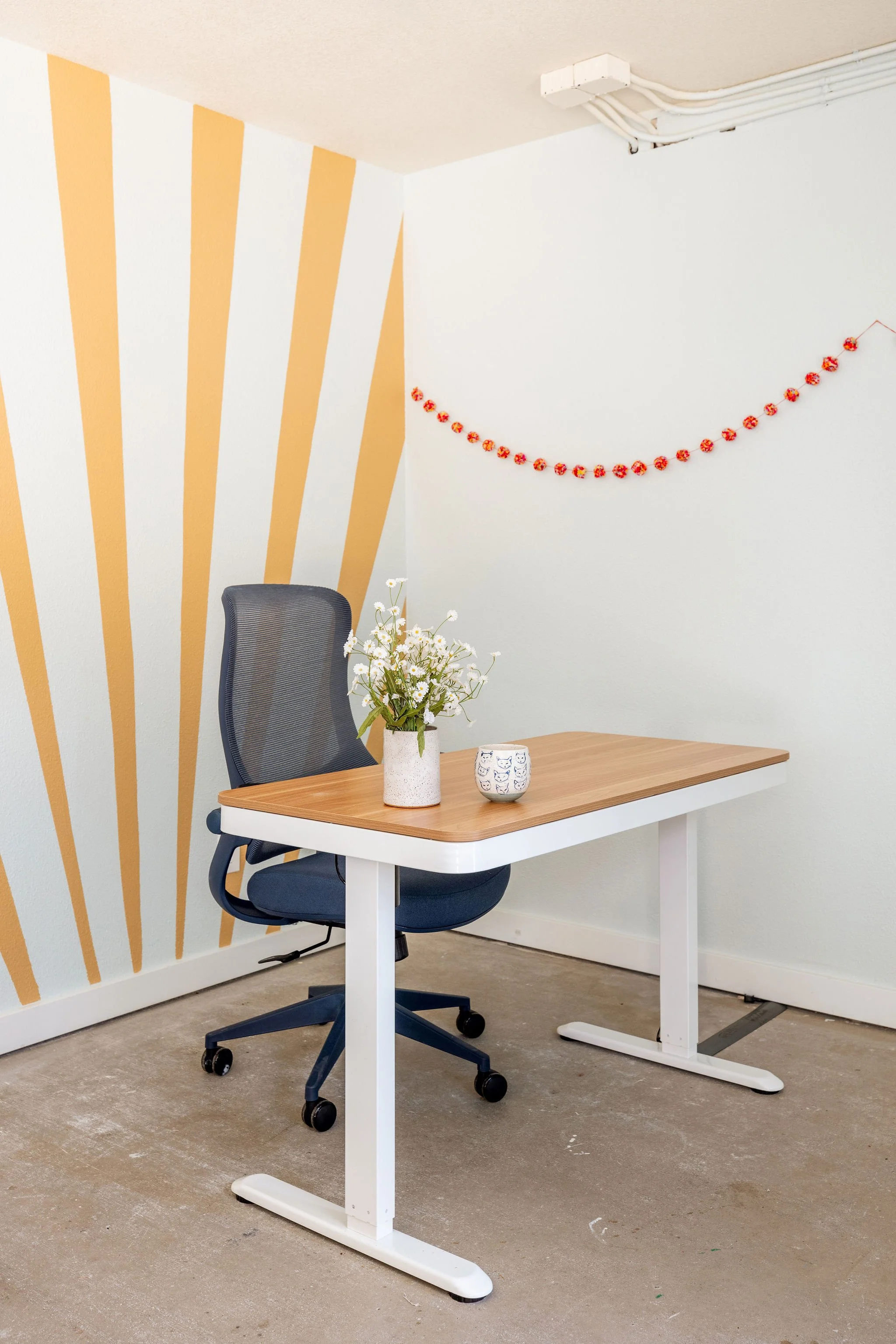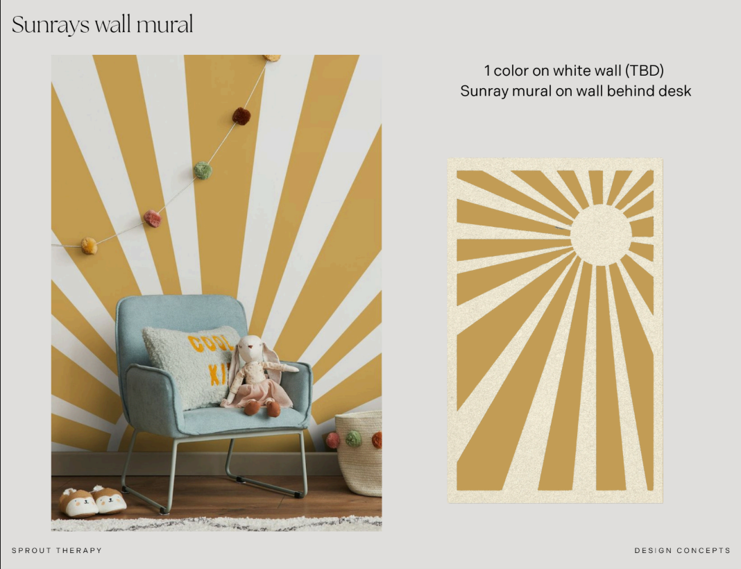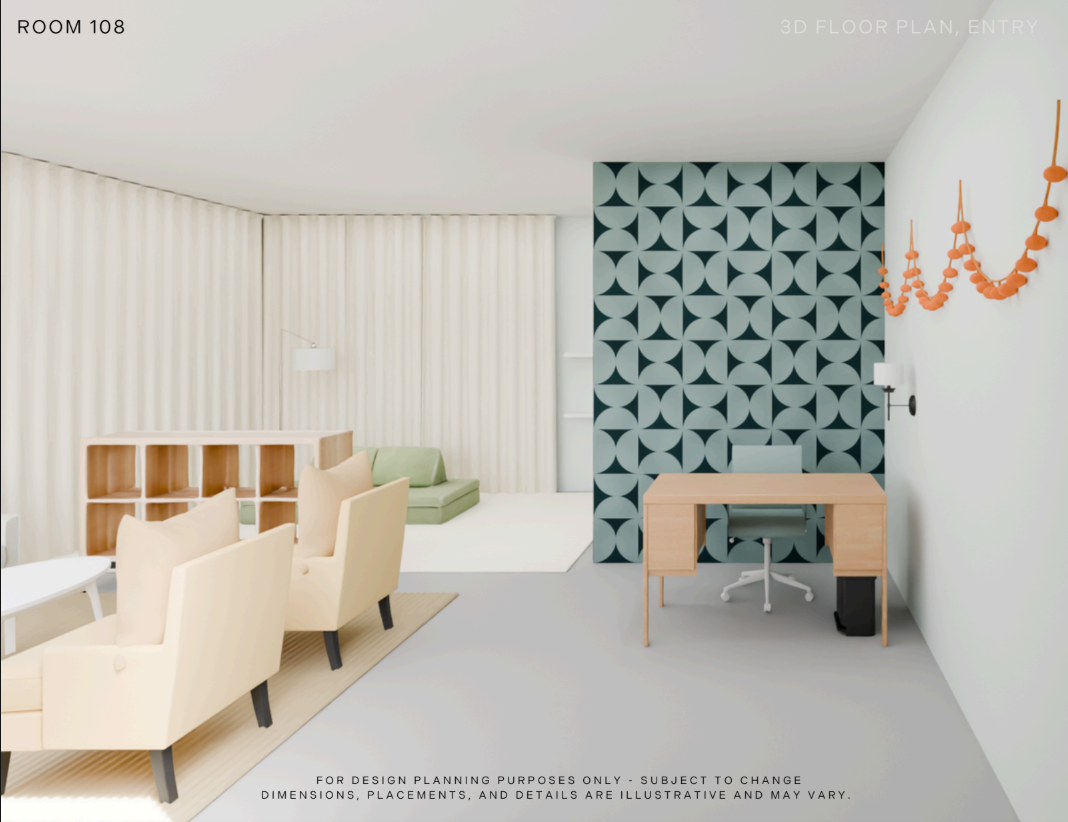 The first things you noticed were the lighting, utilitarian details, and concrete floors–and it all felt cold. So we started there. We replaced the existing fixtures with warmer, steady illumination that supports focus and comfort. We added a sunbeam mural to anchor the room with a bright, optimistic focal point. Then we layered in softness through rugs and curtains, helping cover exposed electrical elements and visually quiet the hard gray floors.