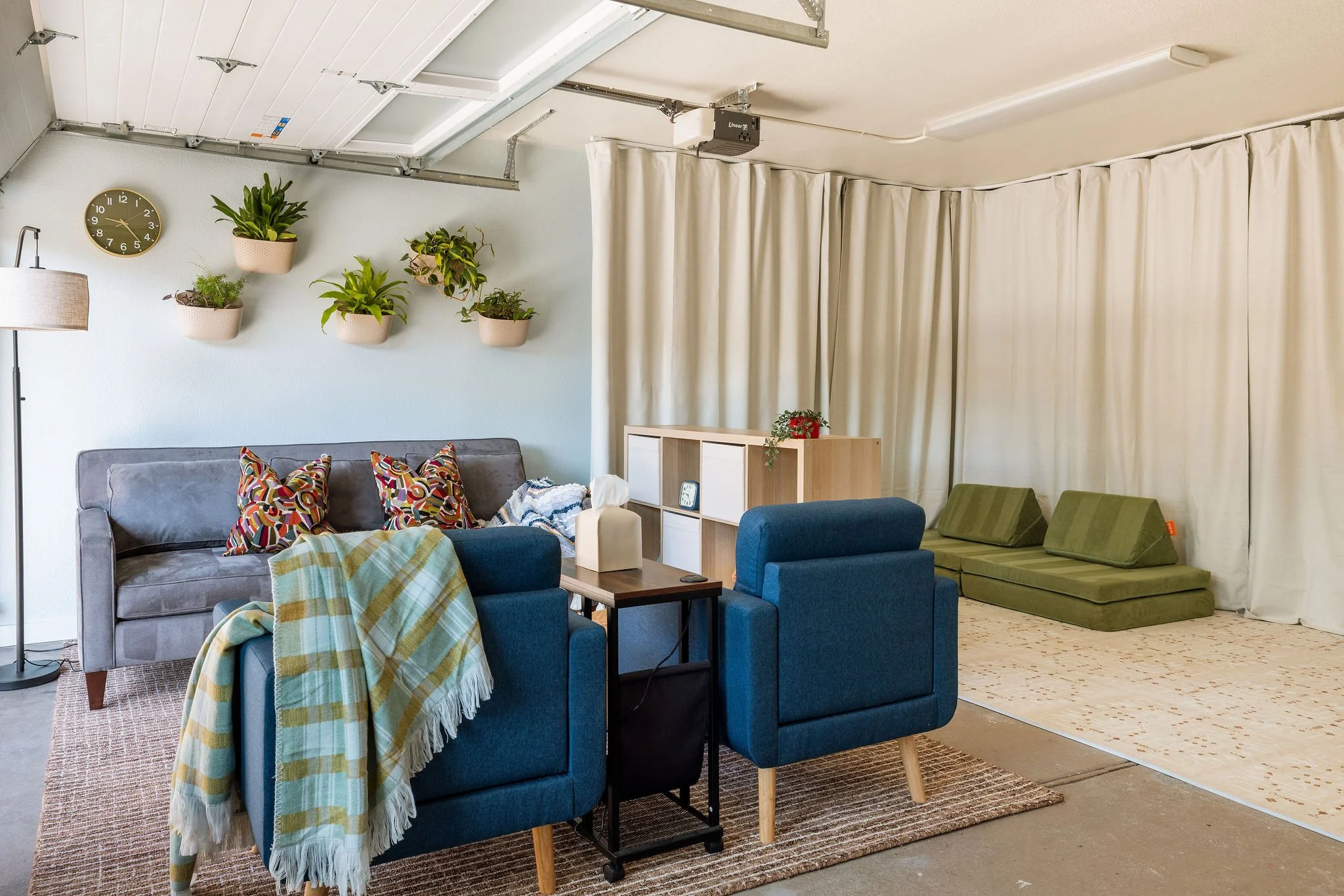 Conversion of a utilitarian garage and furnishing a family-welcoming therapy space to support adult sessions and child-friendly play.
